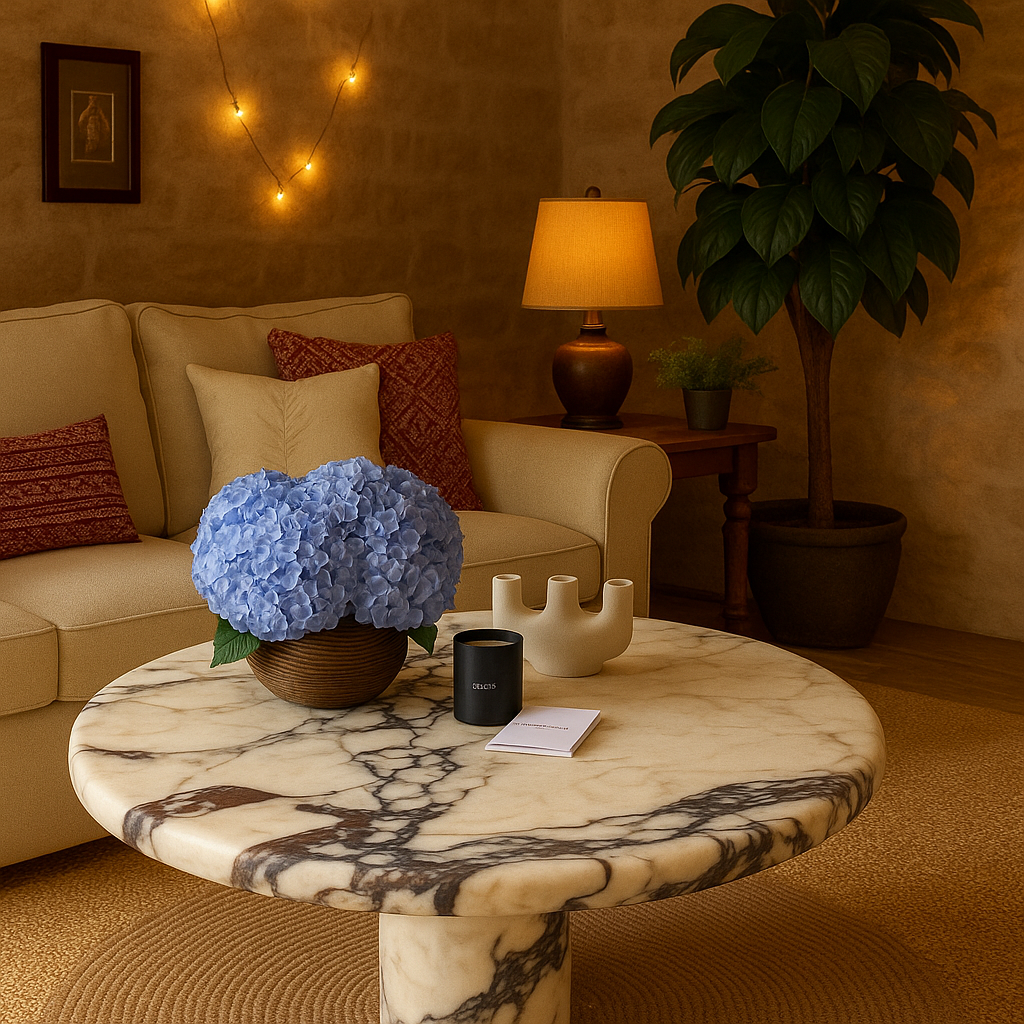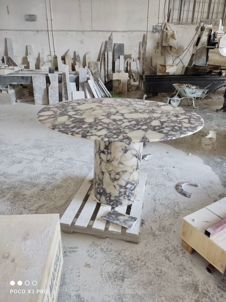 This magnificent pedestal table embodies sculptural luxury with its wide, smooth circular tabletop supported by a solid cylindrical base, all carved from a single slab of marble. The marble showcases a dramatic high-contrast pattern, primarily creamy white or cream, fragmented by expansive patches of deep gray and black veining that flow seamlessly across the entire piece. The "cracked" or "shattered" veining pattern delivers rich texture and captivating visual interest, making the table an immediate focal point. Combining a solid monolithic silhouette with dynamic natural patterns, this piece is a timeless and luxurious centerpiece perfect for dining or statement interiors.