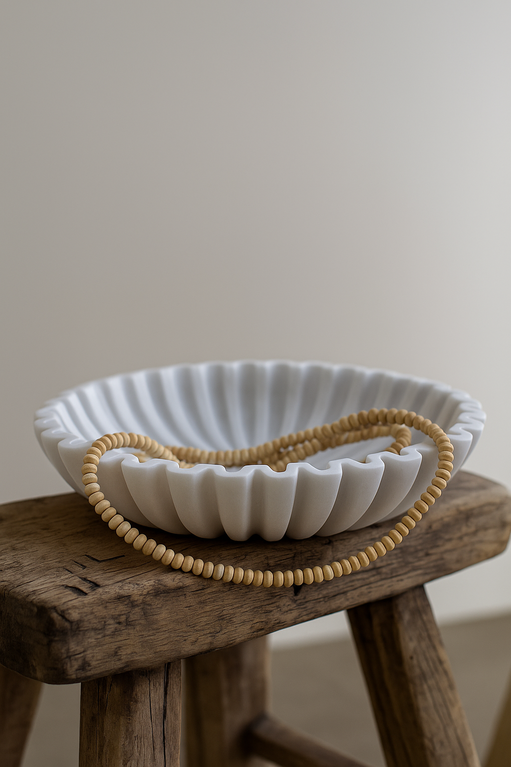 This sculptural bowl is crafted from pristine white marble and features an elegant fluted edge, creating dramatic shadows and a pleasing tactile quality. The substantial weight and crisp geometry make it perfect for use as a centerpiece, catchall, or artful accent on consoles or coffee tables. Paired with natural beadwork, the bowl brings a refined, timeless touch to both modern and traditional decor.