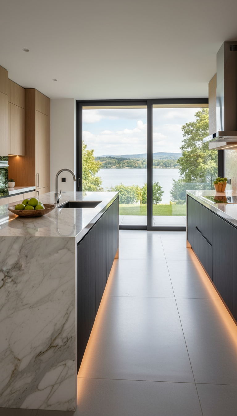 This marble kitchen countertop features dramatic, organic veining and a flawless finish that instantly elevates any culinary space. Its luxurious, cool surface is perfect for both meal preparation and stylish entertaining. The seamless integration with modern cabinetry and under-cabinet lighting makes it a sophisticated focal point for contemporary kitchens.