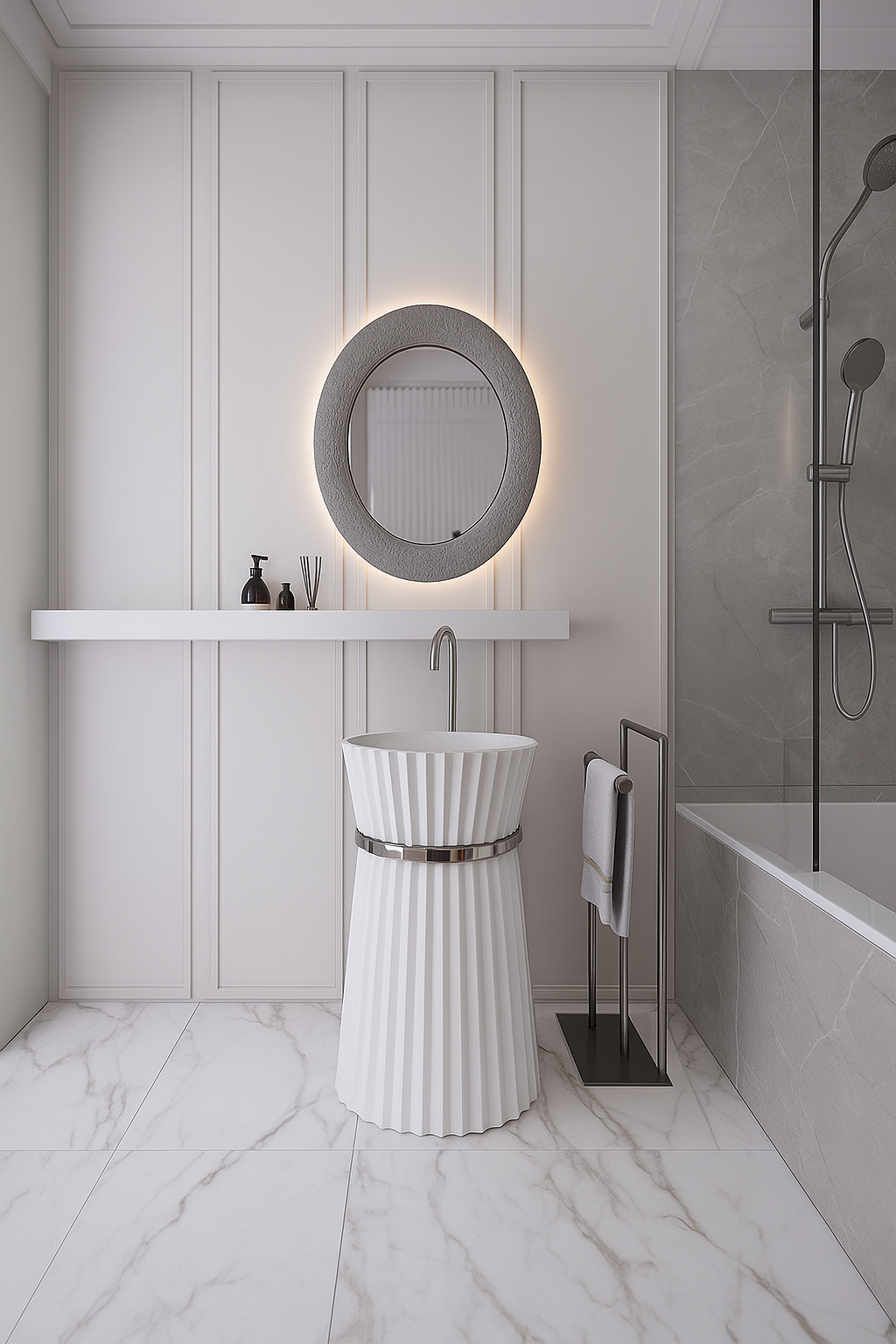 This stunning pedestal basin is a sculptural masterpiece influenced by Art Deco design, characterized by its bold silhouette and refined pleated texture. Crafted from a single piece of smooth white ceramic or stone composite, the column tapers gracefully from base to top, supporting a substantial bowl. The exterior is enveloped in crisp vertical pleating reminiscent of tailored fabric or classical column motifs. A polished metallic band—likely chrome or silver—encircles the basin’s waist, creating a striking visual separator and focal point. This basin blends traditional elegance with a contemporary edge, serving as a luxurious statement piece in sophisticated bathroom interiors.
