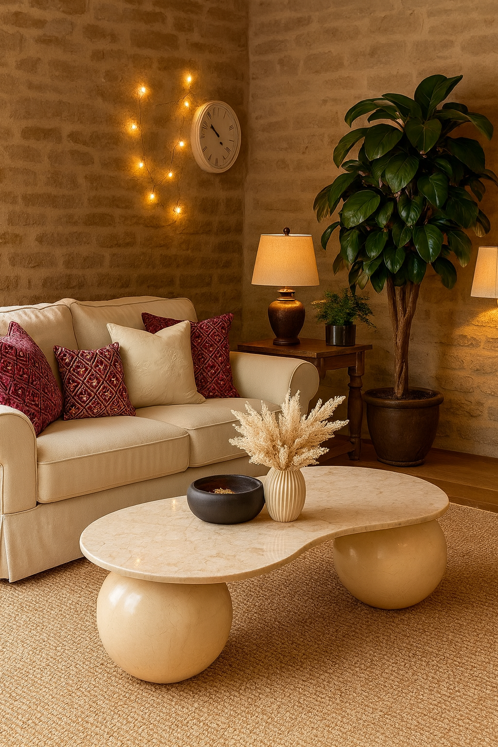 This coffee table stands out with its organic, curvilinear kidney or boomerang-shaped tabletop, offering a visually soothing alternative to traditional forms. Crafted from smooth, pale stone—likely Travertine or lightly veined creamy marble—the piece exudes softness and subtle texture. The substantial top rests on two large spherical bases positioned at opposite ends, marrying fluid shapes with bold geometric supports. This combination evokes a post-modern or Art Deco-inspired aesthetic, where soft monochromatic tones and sculptural form create a striking centerpiece for warm, textured interiors.