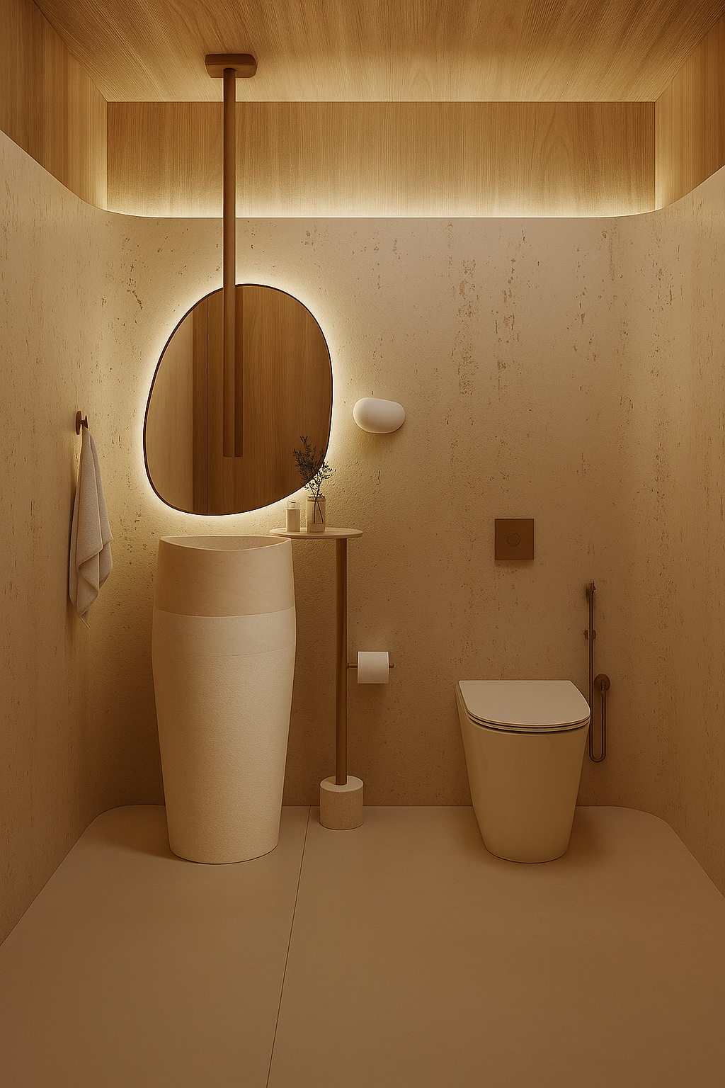 This bold pedestal basin offers a striking contrast of textures and tones, creating a grounded, contemporary aesthetic. The tall, tapered cylindrical column widens at the top, where a smooth, polished rim and basin crafted from creamy beige stone—likely marble or travertine—show delicate natural veining. The lower portion is finished in a rough, textured or sandblasted off-white surface, adding tactile interest and emphasizing natural material authenticity. The inward-curving rim forms an elegant, shallow lip, balancing the sturdy vertical structure with refined simplicity. This basin embodies earthy elegance and honest craftsmanship ideal for modern bathroom spaces.